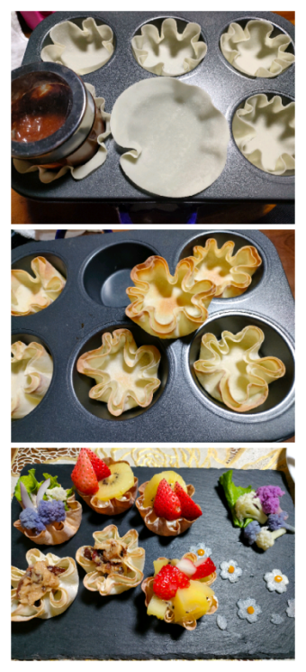 ●冷蔵庫で忘れ去られた餃子の皮が見つかったので、型に押してグリルで8分焼いた。パリパリと焼けたので中に詰め物をして食べた。