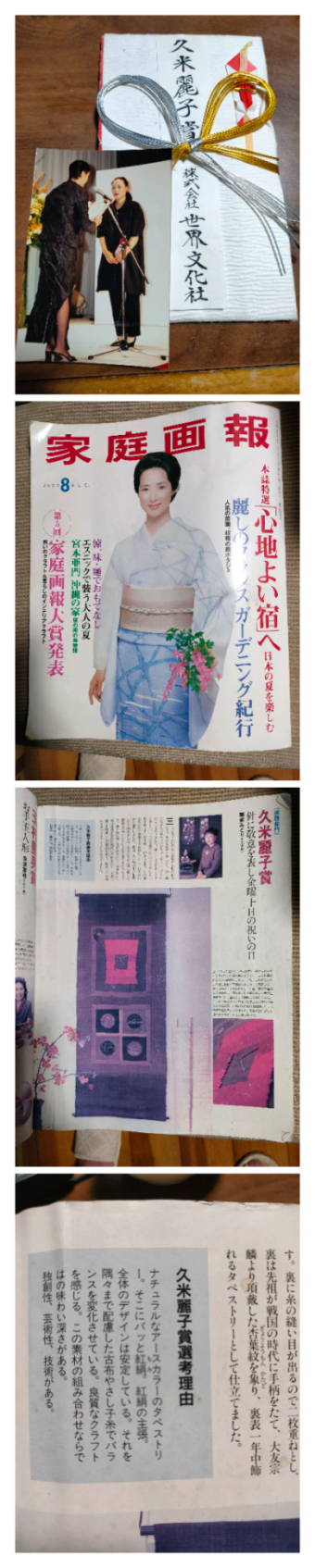 奥さんの麗子さんから家庭画報の手作り作品で選んで頂いた作品、審査委員賞【久米麗子賞】東京のホテルで一緒に写真を撮ったことが思い出される。賞状何処に行ったかな?