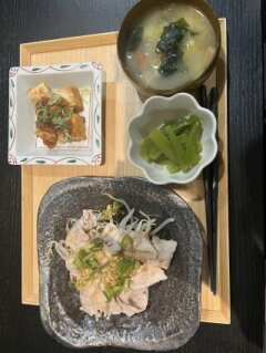 ◆夕食:豚しゃぶサラダ、山くらげ、厚揚げの煮物、味噌汁