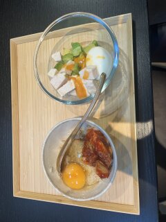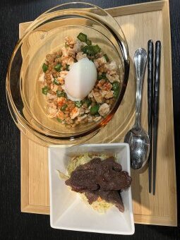 ◆昼食:キムチ卵がけご飯、アボカドとサラダチキンのサラダ