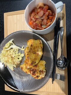◆夕食:ささみの香草パン粉焼き、アンチョビキャベツ、野菜トマトスープ