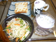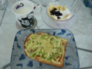 トースト 低脂肪牛乳 ミックス野菜(ブロッコリー カリフラワー アスパラ にんじん)とキャベツに塩コショウとピザチーズでチン バナナ 牧場のヨーグルト