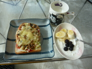 納豆ピザ(ピザソース ピザチーズ ひじき入り納豆 玉ねぎ キャベツ ツナ ミニトマト) 低脂肪牛乳 ヨーグルト バナナ半分 冷凍ブルーベリー