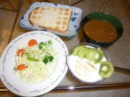 トースト カレー(ニンジン たまねぎ じゃがいも 豚肉) チン野菜(カリフラワー ブロッコリー ニンジン アスパラ キャベツ えのき) ヨーグルト バナナ半分 キウイ1個