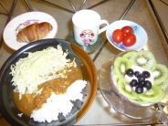 カレーライス(ご飯お茶碗に軽く半分程 にんじん 玉ねぎ 豚肉 じゃがいも)にチン野菜のせ(キャベツ えのき) ミニチョコクロワッサン 低脂肪牛乳 ヨーグルト キウイ1個 冷凍ブルーベリー ミニトマト3個
