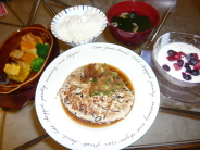 ご飯1膳 和風ハンバーグ(鶏ひき肉 豚ひき肉 芽ひじき 玉ねぎ パン粉 牛乳 卵 えのき 塩コショウ 大根おろし しょうゆ ねぎ)←本見て作ってみたけど簡単でボリュームありあり♪だけどお肉たった75g!179カロリー。カボチャ塩コショウとチーズのせオーブンで ブロッコリー 松茸風お吸い物(ワカメ入れて) ヨーグルト ブルーベリーとイチゴのせ